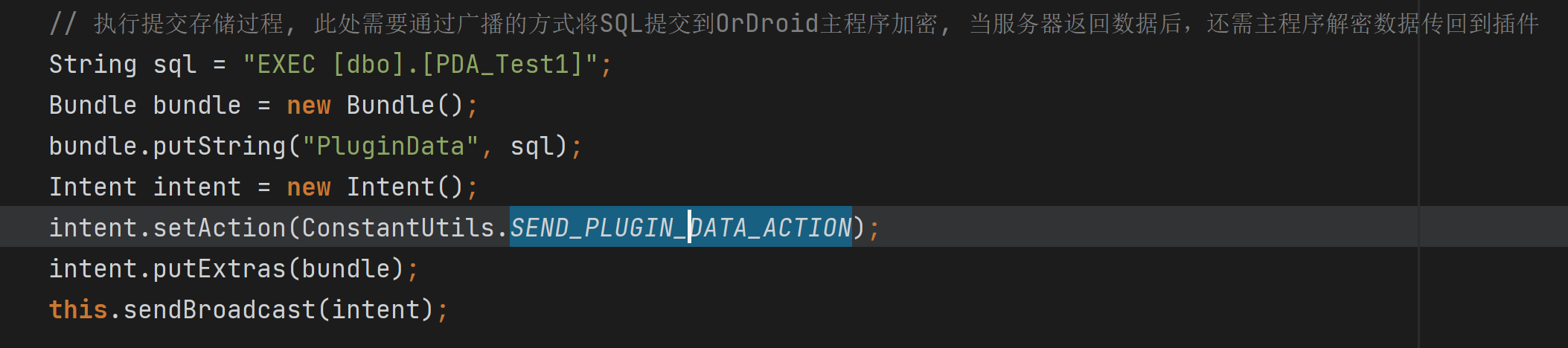# 一、背景与目的 现实项目中,有些特殊的项目需求可能移动事务对象插件已经无法满足了,比如一些特殊硬件的接入(如蓝牙电子秤),或者其它一些特殊的需求,这时候可能需要用户开发自定义的插件,本手册主要侧重于介绍自定义插件的开发过程中的注意事项。 # 二、下载开发Demo APP插件可从PKM中下,从”产品”分组中打开”软件版本管理”元对象插件,选择”012 OrDroid APP 软件 V15.2(推荐使用)”,在”文件列表”中找到”OrDroidPluginSample.zip”下载,如图。  # 三、插件与OrBit平台的数据交互 由于插件与OrBit平台的数据交互使用了加密方式,开发人员可通过如下方式与OrBit平台进行数据交互 3.1 向OrBit平台发送请求数据 拼接执行SQL,完成后可通过广播的方式,将请求发送至"OrDroid"主程序,如图。  3.2 接收OrBit平台返回数据 3.2.1 注册数据接收广播,如图。  3.2.2 在广播接收器中,获取返回数据,如图。  # 四、注册Activity 注意,被启动Activity不能注册为LAUNCHER,如图。  # 五、配置OrDroid插件 5.1 在"OrDroid插件"中,创建一个插件,如图。  5.2 打开"用户组管理"元对象插件,选择"OrDroid"应用系统,点击"菜单组"页签,选择/创建一个菜单组,选择"OrDroid菜单项"页签,将插件添加分组,如图。  # 六、将生成的插件APP复制到服务器插件库目录即可。 # 七、开发示例下载 [【附件】OrDroidPluginSample.zip](/media/attachment/2024/03/OrDroidPluginSample.zip)