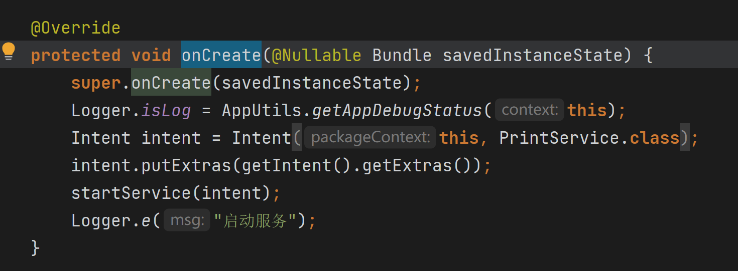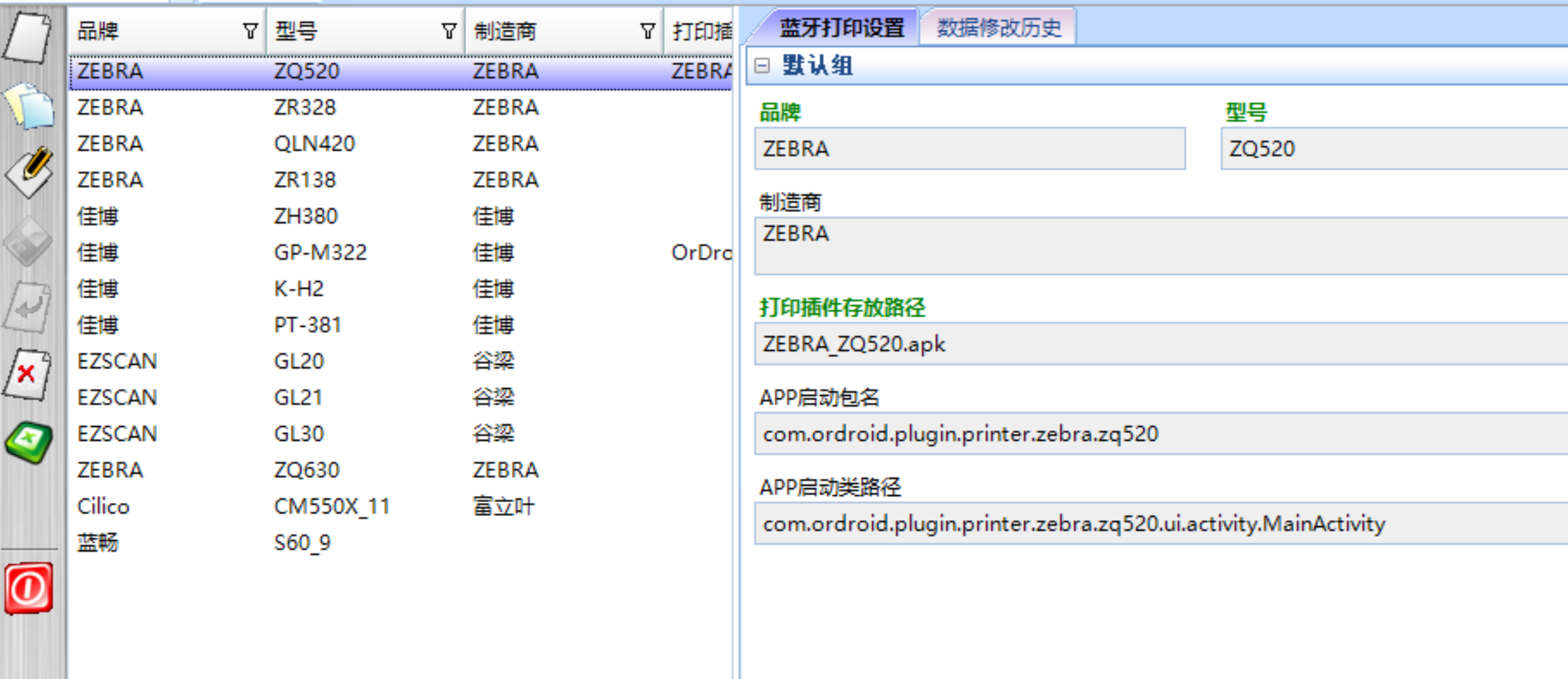 # 一、下载开发demo APP插件可从PKM中下,从”产品”分组中打开”软件版本管理”元对象插件,选择"012 OrDroid Print Apk V15.2",在”文件列表”中找到”OrDroidPrinter.zip”下载,如图。  # 二、 Activity开发 2.1 注册Activity 注意,被启动Activity不能注册为LAUNCHER,如图。  2.2 在onCreate方法中启动打印服务,如图。  2.3 在onResume方法中注销此Activity,如图。  # 三、Service开发 3.1 获取标签数据包 在onStartCommand方法中,通过intent参数获取bundle对象,调用getParcelableArrayList方法获取ArrayList<Bundle>对象,注意,ArrayList<Bundle>对象为标签打印队列,如图。  3.2 Bundle中的key对象 从ArrayList<Bundle>中提取Bundle对象,以下为Bundle对象中使用的key值介绍。 "path":标签存放路径 "ZPL":斑马ZPL指令 "Copies":标签打印份数 "Concentration":文字浓度 "Gap":间距 "LableSizeX":标签宽度(斑马打印机须设置成-1自适应尺寸,佳博打印机须按实际尺寸填写) "LableSizeY":标签高度(斑马打印机须设置成-1自适应尺寸,佳博打印机须按实际尺寸填写) "leftMargin":图片左边距 "ImageResolution":图片分辨率 "PrintX":打印坐标X "PrintY":打印坐标Y "Direction":打印方向 "Speed":打印速度 "GapType":间隔类型(GL21打印机参数:0.打印机默认设置类型, 1.使用带定位孔的标签纸进行定位,2.使用间隙纸进行打印,3.使用黑标纸进行打印) "Orientation":打印页面旋转角度(GL21打印机参数, 可设置对应角度0、 90、 180、 270度) # 四、配置"蓝牙打印设置"元对象 打开 “PORP 蓝牙打印设置” 插件,维护对应的打印机品牌、型号、打印插件存放路径、APP启动包名、APP启动类路径,如图。  # 五、将APP复制到服务器插件库目录即可