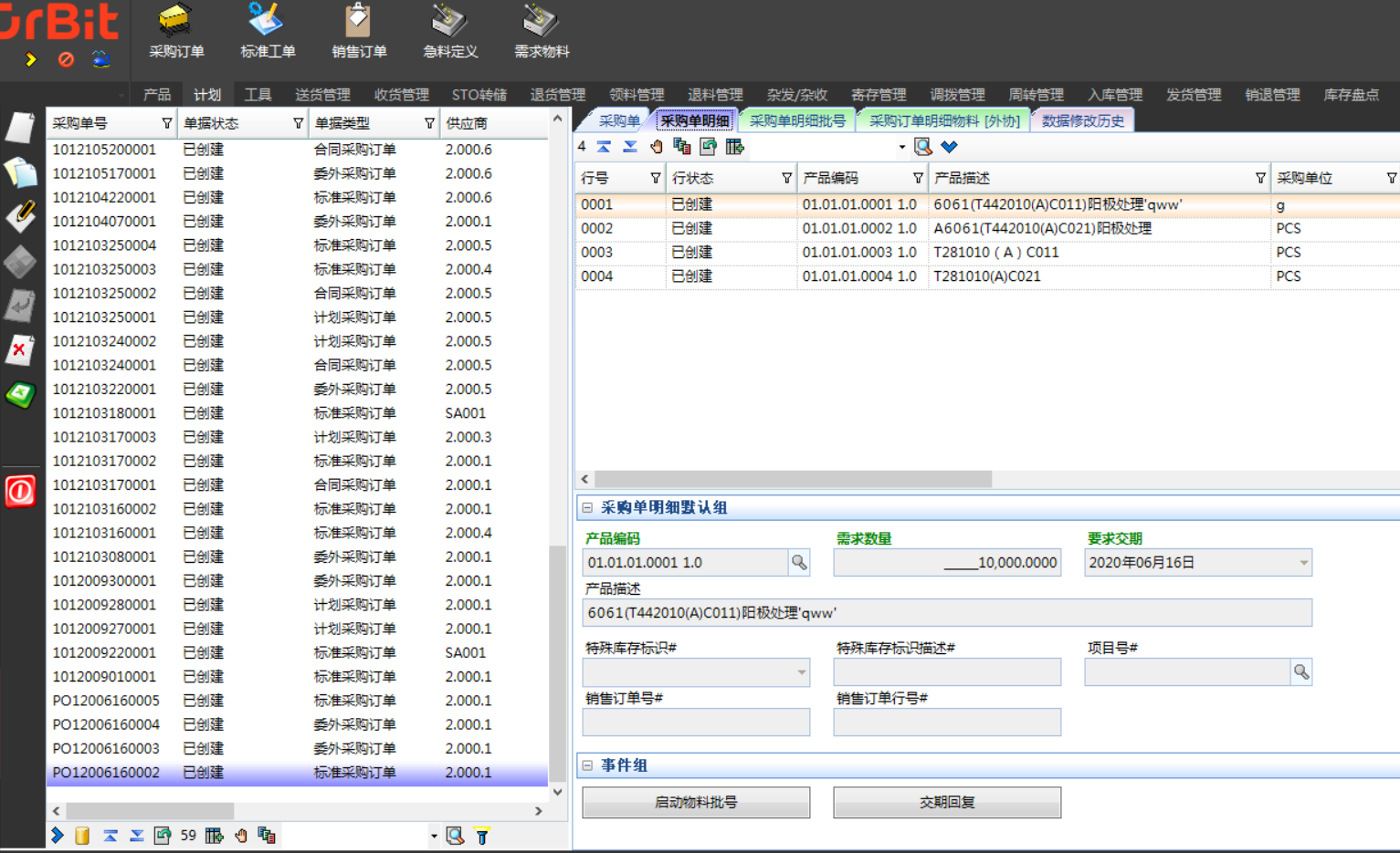 # 2.0 概述 计划包括采购订单、标准工单、销售订单 # 2.1 采购订单 入口:【计划】>【采购订单】 1)企业根据产品的用料计划和实际能力以及相关的因素,所制定的切实可行的采购订单计划,并下达至供应商执行,在执行的过程中要注意对订单进行跟踪,以使企业能从采购环境中购买到企业所需的商品,为生产部门和需求部门输送合格的原材料和配件。在WES系统包括普通采购和委外采购 2)创建采购单:输入工厂、供应商、采购物料明细 3)采购单同步:按弹框选择采购单的物料明细同步到当前采购物料明细,简化物料明细录入  4)启动物料批号:如果供应商在生产过程中贴标就在物料明细中启动物料批号 5)交期回复:设置交货日期 6)按箱号/区间撤销:对已启动的批号进行删除操作  # 2.2 标准工单 入口:【计划】>【标准工单】 1)创建工单:输入工厂、产品、数量保存 2)工单审核/弃审:批准生产工单/拒绝工单生产 3)生产领料单:通过工单创建生产领料单,领取生产的物料 4)展开/更新BOM: 生产的产品根据BOM结构【生成/更新】工单明细 5)工艺路线初始化:配置生产工艺以及生产优先级用于排期  6)启动工单批号:按工单生成工单明细批号 7)启动物料批号:生成原材料的批号 8)规程设置:更新明细规程 9)设置替代料组:设置替代物料 10)指定供应商/批次:指定物料的供应商和物料批次 11)生成工单任务:生成工单任务,只有成品也就是第一行选中后才能执行  12)取消工单批号:删除工单批号 13)审核:批次审核 14)按批次初始化任务:生成排程任务  15)启动工单任务单批号:按工单任务生成工单明细批号,工序点检需要在此启动批号 16)初始化排程任务:同<按批次初始化任务>生成排程任务  17) 重置流程节点:重置工单生产流程 18)清除流程节点:清除工单生产流程 19)启用流程节点:启用节点 20)禁用流程节点:禁用节点  21)规则值配置:配置排程规则值  22)申请/取消栈板SN:为工单【申请/取消】栈板号 23)申请/取消箱号:为工单【申请/取消】箱号 24)关联工单:关联其它工单  # 2.3 销售工单 入口:【计划】>【销售工单】 1)创建销售单:输入客户、工厂、发货工厂创建销售单据 2)创建销售单明细:选择销售单切换到明细,输入产品、数量、交货日期创建明细  # 2.4 急料定义 入口:【计划】>【急料定义】 1)定义在一定时间范围内的紧急物料料信息,目的是督促品质检验人员尽快检验