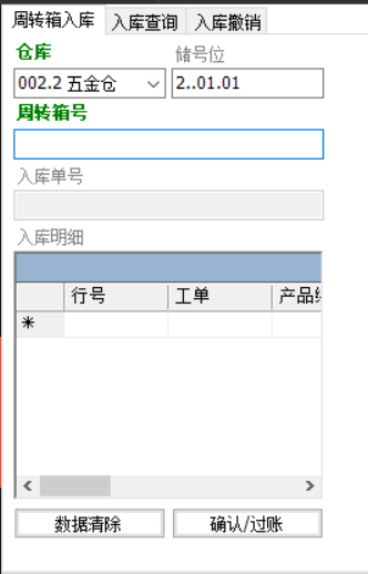 # 9.0 概述 该模块包括周转工具、周转箱入库,周转箱发料、周转箱转料 # 9.1 周转工具 入口:【周转管理】>【周转工具】 1)批量添加周转工具:一次添加多个周转工具 2)可用/停用/报废:设置周转工具为【可用/停用/报废】状态  # 9.2 周转箱解绑/并入 入口:【周转管理】>【周转箱解绑/并入】 1)周转箱解绑:把批号从周转箱脱离出来或者把整个周转箱的批号脱离出来  2)周转箱并入:把物料批号并入周转箱进行绑定  # 9.3 周转箱入库 入口:【周转管理】>【周转箱入库】 1)确认/过账:会自动根据箱内的产品生成入库批次(比如一个周转箱装了A产品10片,B产品20片,那么入库时,会自动生成2个批次进入库存,同时绑定着周装箱,即入了库之后,就不管单片了,只管具体的产品有多少)  # 9.4 周转箱发料 入口:【周转管理】>【周转箱发料】 1)确认/过账:1.如果一个周转箱装有多个产品,扫描周转箱后,需要选择发料的物料和发料数量,会自动打印一个批次条码(请跟随物料发往产线,可用于上料);2.如果一个周转箱装有一个产品,且数量没有超过领料单需求数,则自动完成发料(按整个周转箱发完产线,可用于上料);3.如果一个周转箱装有一个产品,且数量超过领料单需求数,则需要选择物料和发料数,会自动打印一个批次条码(请跟随物料发往产线,可用于上料)  2)撤销:撤销时,可以撤销的物料放入到一个新的周转箱中。强烈建议放入到新的周转箱(如果是按周转箱撤销则不需要),因为这样才可以继续用周转箱发料  # 9.5 周转箱转料 入口:【周转管理】>【周转箱转料】 1)转料:把当前周转箱物料转移到另外一个周转箱