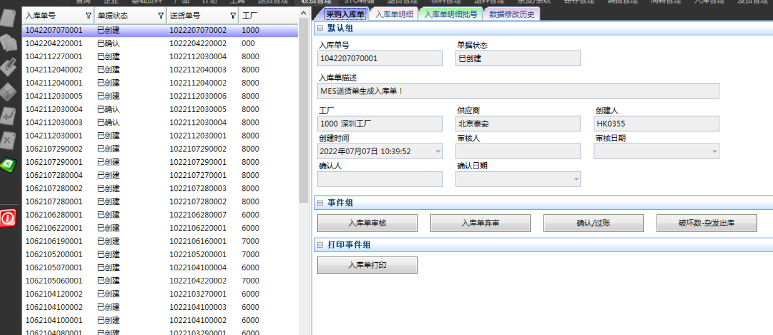 # 4.0 概述 该模块对送货单进行点收上架,生成送货到货单、拒收单、入库单、杂收单的过程 # 4.1 来料点收/上架作业 入口:【收货管理】>【来料点收/上架作业】 1)收货确认:收货组收货确认或者仓管员对送货单的送货批号物料进行点收放到暂存区,然后生成检验单和送货到货单,检验完成后进行上架作业从暂存区上架到仓库储位,并根据结果生成【入库单/拒收单】  # 4.1 点收上架 入口:【收货管理】>【点收上架】 1)收货确认:这个功能是用于把物料直接放在仓库货架上,然后生成检验单检验,检验完成后进行上架作业从暂存区上架到仓库储位,并根据结果生成【入库单/拒收单】  # 4.4 收货批次打印 入口:【收货管理】>【收货批次打印】 1)收货确认:在WES上不操作送货流程,直接从物料直接收货,然后生成检验单检验,检验完成后进行上架作业从暂存区上架到仓库储位,并根据结果生成【入库单/拒收单】  # 4.5 到货拒收 入口:【收货管理】>【到货拒收】 1)到货拒收:仓库接收供应商送达的物料时,如果发现明显的、严重的问题,这种情况下,仓管员可以直接拒收。拒收时,只能按行物料一次性拒收,点击“到货拒收”时,会自动生成拒收单。与“来料点收”属于并行互斥功能 2)撤销:撤销拒收单并删除单据  # 4.6 送货到货单 入口:【收货管理】>【到货拒收】 1)创建:来料点收/点收上架生成送货到货单,送货到货单包括了采购到货单、外委到货单、其他到货单 2)确认/过账:确认已到货  # 4.7 采购/委外/其它拒收单 入口:【收货管理】>【采购/委外/其它拒收单】 1)创建:采购检验后出现的不合格品将退回给供应商,这种情况称为验退单,也叫拒收单。在WES系统中,分3种单据:采购拒收单、委外拒收单、其他拒收单,分别对应采购送货单、委外送货单、其他送货单 2)审核/弃审:审批单据 3)确认/过账:确认单据  # 4.8 采购/委外/其它入库单 入口:【收货管理】>【采购/委外/其它入库单】 1)创建:供应商送货经过检验后,合格品办理正式入库。采购入库是物权转移的一个标准,代表着采购物料的所有权由供应商转移给企业。在WES系统中,分3种据:采购入库单、委外入库单、杂收单,分别对应采购送货单、委外送货单、其他送货单。当然备品也是生成杂收单 2)审核/弃审:审批单据 3)确认/过账:确认单据 4)杂发出库:在IQC检验中如果有破坏试验,破坏试验的抽样数即为破坏数,就需要生成杂发出库单
