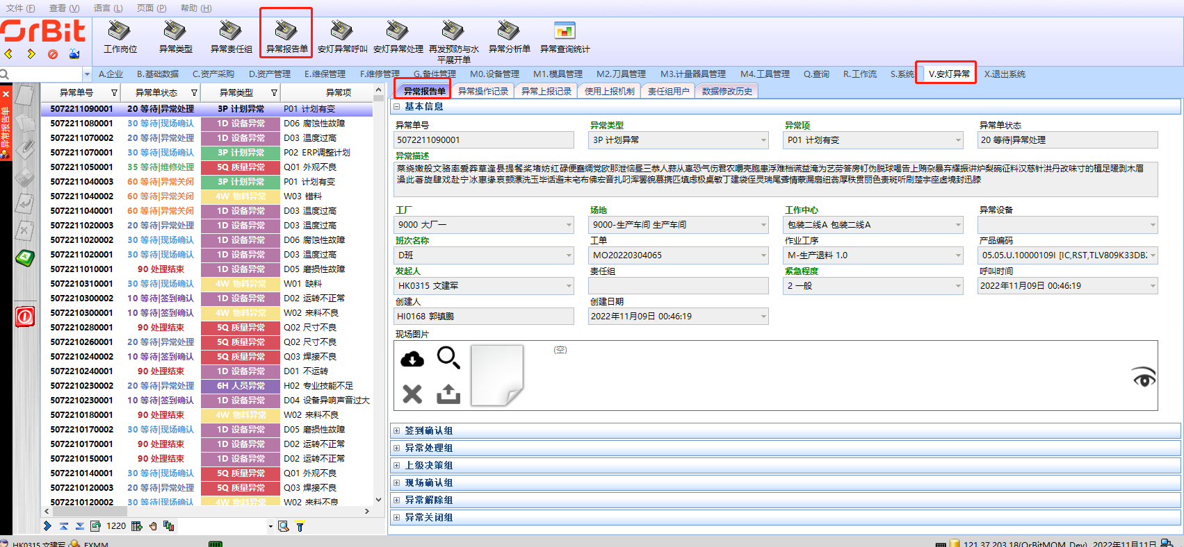 # 安灯异常系统概述 安灯异常管理系统提供了一套对企业在生产过程中所产生的各种异常问题的处理流程和方法,及时的记录企业在生产过程中产生的各种异常问题,且对这些异常的处理有一套完整的处理流程直至处理完毕,在流程处理过程中加上了自动异常处理提醒 和 自动的异常超时上报处理提醒 功能,将异常信息及时且准确的通知到相关处理人员,从而使得这些异常问题也能得到及时处理。下面将对该系统做详细的功能和操作说明。 **阅读前用词约定 :** 在该说明中,一旦提到 工厂、场地、工作中心,可将三者统一概称为 **工作位置** **异常处理流程图预览如下 :**  # 1 工作岗位(废弃) # 1.1 工作岗位 **1.1.1 概述** **工作岗位** 是指在指定 **工作位置** 上的一个具体 **岗位** 下面说明下 **岗位** 和 **工作岗位** 的区别 **岗位** 是一个简单单纯的职位称呼,如车间主任、机修工等等 **工作岗位** 是在一个具体 **工作位置** 上的一个 **岗位**,也就是 工作岗位=工作位置+岗位 **1.1.2 功能路径** 【安灯异常】主菜单 >> 【工作岗位】子菜单 >> 【工作岗位】页签  **1.1.3 字段说明** | 字段名称 | 字段说明 | | --- | --- | | 工作岗位编号 | 系统自动生成,无需填写 | | 岗位 | 选择岗位,可选岗位可在用户编码管理中进行维护 如图:  | | 工作岗位描述 | 给工作岗位添加个简单的描述 | # 1.2 岗位员工 **1.2.1 概述** 设置每个 **工作岗位** 包含的员工用户,一个工作岗位可以包含多个员工用户。 **1.2.2 功能路径** 【安灯异常】主菜单 >> 【工作岗位】子菜单 >> 【岗位员工】页签  **1.2.3 字段说明** | 字段名称 | 字段说明 | | --- | --- | | 责任员工 | 选择添加该 **工作岗位** 的 员工用户 | # 2 异常类型 # 2.1 异常类型 **2.1.1 概述** 异常类型,是对企业在生成过程中产生的异常进行了一个大类的分类,如设备异常,物料产品异常等等 **2.1.2 功能路径** 【安灯异常】主菜单 >> 【异常类型】子菜单 >> 【异常类型】页签  **2.1.3 字段说明** | 字段名称 | 字段说明 | | --- | --- | | 异常类型代码 | 给异常类型取一个标识码,也便于在程序代码中识别指定的异常类型 | | 异常类型 | 给异常类型取一个类别名称 | | 异常类型描述 | 给异常类型做个简单描述 | | 节点处理消息对象 | 指定该类型异常的异常在处理过程中通知下一个节点处理人员时,使用的消息对象 | | 超时提醒消息对象 | 指定该类型异常的异常在处理超时异常上报通知时,使用的消息对象 | # 2.2 异常项 **2.2.1 概述** 异常项就是在上述的每个 **异常类型** 中再具体进行了一个小类别的划分,可称为 异常类型明细项 **2.2.2 功能路径** 【安灯异常】主菜单 >> 【异常类型】子菜单 >> 【异常项】页签  **2.2.3 字段说明** | 字段名称 | 字段说明 | | --- | --- | | 异常项代码 | 给异常项目取一个编码标识,用于唯一标识该异常项 | | 异常项目名称 | 给异常项这取一个简短名称 | | 是否激活 | 该异常项目是否启动使用 | | 是否By异常项 | 如果选择则对 **升级机制** 的编辑设置是否是只针对于当前异常项的设置,不选择则对 **升级机制** 的编辑设置就是对该异常项所属的异常类型进行的设置 | | 知会岗位 | 当在编辑设置 **升级机制** 的时候如果没有指定 知会岗位 则使用这里的知会岗位作为默认知会岗位 | | 异常项描述 | 给该异常项做一个简短的描述,说明下该异常项会包含一些什么样的异常 | | 是否抄送下级 | 是指该异常项的异常在发生处理延迟上报机制的时候,除了给当前要上报的级别人员发送消息提醒外,是否还需要给该级别的下级级别人员同时上报提醒消息 | | 最高升级级别超时时间(分钟) | 是指在该异常项的异常在发生处理延迟上报机制且已经上报到最高级别仍然没有处理的情况下,是否在每隔指定的超时间隔时间后一直上报最高级别人员,直至异常被处理,才停止上报。如果设置为0则不再上报 | **2.2.4 升级机制的设置** 异常升级机制是用来设置该 **异常类型** 或者 **异常项** 的所有异常如果在超时未处理的情况下,如何对不同级别的岗位人员进行消息提醒的规则管理。该设置精确到**工厂**、**场地**、**紧急程度**、**异常处理节点**,然后对精确到的位置设置多级别的上报规则,且需对每个级别设置 超时时间 和 上报提醒的岗位。系统会先通知最低上报级别的工作岗位的员工,然后依次往上通知高上报级别的工作岗位的员工,直到异常处理完毕。  点击 升级机制组 的 升级机制(双击可编辑) 文字,可弹出 升级机制设置对话框,如下图:  下面对该对话框中可设置的字段信息加以说明 | 字段名称 | 字段说明 | | --- | --- | | 异常项名称 | 设置针对的异常项,如果为空,则是针对异常类型的统一设置,不可选择| | 工厂 | 设置针对的工厂 | | 场地 | 设置针对的场地 | | 紧急程度 | 指定要设置何种紧急程度的异常,紧急程度的维护在用户编码中进行如图: | | 异常上报节点 | 设置处理通知或升级上报的异常处理节点 | | By异常项目 | 从选择的异常项目带出来的是否By异常项目,不可选择 | | 实际上报级别 | 如果是0级别,则是在一个节点处理完后立马通知 用户岗位 和 知会岗位 的用户,且只有用户岗位的人员有权进行处理。如果是1级或以上的级别则是用来进行超时升级上报通知,可以根据实际需要调整级别数量,维护级别数量的地方在用户编码管理中 如