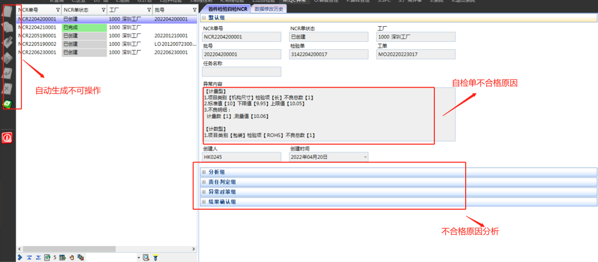 # 3.10.1 首件自检NCR **【功能说明】**:用于展示首件自检不合格通知单,并且对检验异常进行处理。首件自检不合格时会自动生成首检自检NCR单,然后对异常结果进行分析并确认。 **【入口】:**【QC异常】>【首件自检NCR】 **【操作步骤】:** 1. 选择“QC.异常”菜单组,进入“首检自检NCR”功能,页面展示通知单信息  # 3.10.2 首件检验NCR **【功能说明】**:用于展示首件专检不合格通知单,并且对检验异常进行处理。首件专检不合格时会自动生成首件检验NCR单,然后对异常结果进行分析并确认。 **【入口】:**【QC异常】>【首件检验NCR】 **【操作步骤】:** 1. 选择“QC.异常”菜单组,进入“首件检验NCR”功能,页面展示通知单信息  # 3.10.3 巡检检验NCR **【功能说明】**:用于展示巡检不合格通知单,并且对检验异常进行处理。巡检检验不合格时会自动生成巡检检验NCR单,然后对异常结果进行分析并确认。 **【入口】:**【QC异常】>【巡检检验NCR】 **【操作步骤】:** 1. 选择“QC.异常”菜单组,进入“巡检检验NCR”功能,页面展示通知单信息  # 3.10.4 完工检验NCR **【功能说明】:**用于展示完工不合格通知单,并且对检验异常进行处理。完工检验不合格时会自动生成完工检验NCR单,然后对异常结果进行分析并确认。 **【入口】:**【QC异常】>【完工检验NCR】 **【操作步骤】:** 1. 选择“QC.异常”菜单组,进入“完工检验NCR”功能,页面展示通知单信息  # 3.10.5 出货检验NCR **【功能说明】:**用于展示出货检不合格通知单,并且对检验异常进行处理。出货检验不合格时会自动生成出货检检验NCR单,然后对异常结果进行分析并确认。 **【入口】:**【QC异常】>【出货检验NCR】 **【操作步骤】:** 1. 选择“QC.异常”菜单组,进入“出货检验NCR”功能,页面展示通知单信息