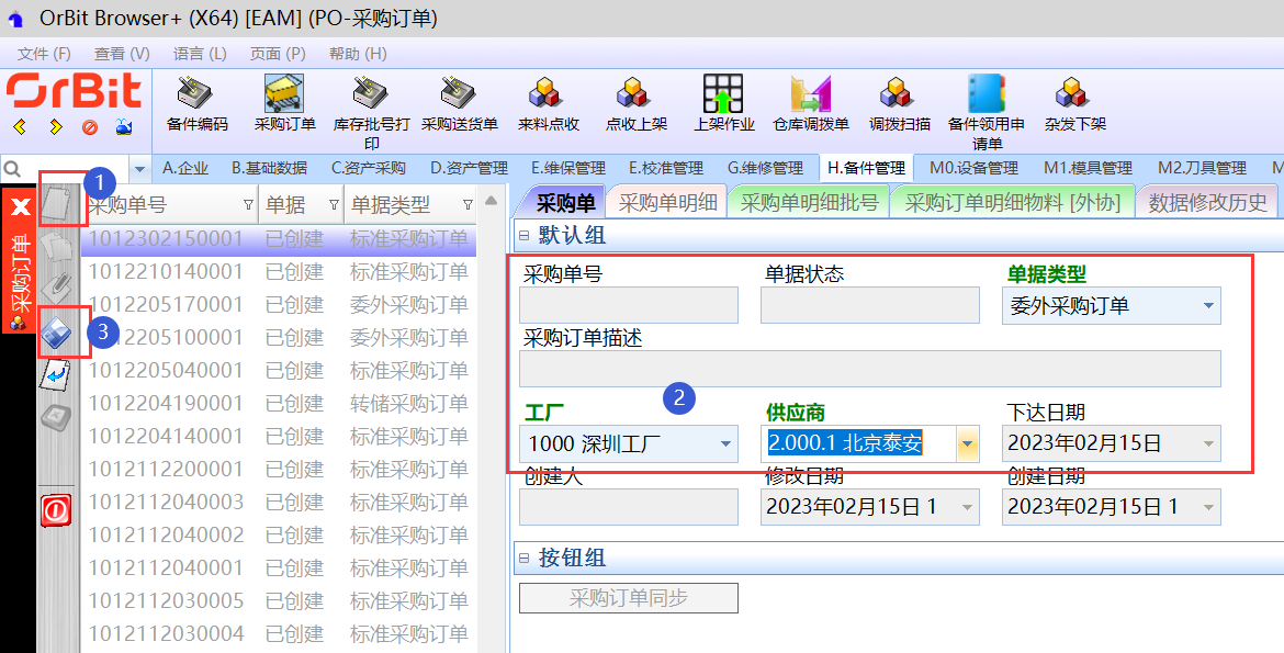# **3.9.1.备件编码** **【功能说明】**:赋予备件产品一个唯一的编码,数据过滤自【基础数据】>【产品】中“产品大类”为“ATPT工具配件/CTPT刀具配件/EQPT设备配件/MDPT模具配件/MIPT计量器具配件”,也可以在此功能新增备件数据。 **【入口】**:【H.备件管理】>【备件编码】 **【操作前提】**:无 **【操作步骤】**: 1)**新增**:点击“新增”按钮 -> 维护备件基本信息、备件特性组、库存特性组、寿命属性组信息 -> 点击“保存”按钮;  2)**修改**:选择备件编码 -> 点击“修改”按钮 -> 修改备件的基本信息、备件特性组、库存属性组、寿命属性组信息 -> 点击“保存”按钮;  3)**查看库存明细**:用于查看备件的库存信息。  4)**查看维保维修记录**:用于查看备件的维保维修记录。  **【注意事项】**:无 **【字段说明】**:无 # **3.9.2.采购订单** **【功能说明】**:用于备件采购,创建备件采购单 **【入口】**:【H.备件管理】>【采购订单】 **【操作前提】**:提前维护备件编码 **【操作步骤】**: 1)**建单**:点击“新增”按钮 -> 输入采购单信息 -> 点击“保存”按钮;  2)**修改**:选择采购订单 -> 点击“修改”按钮 -> 修改采购单信息 -> 点击“保存”按钮;  **【注意事项】**:无 **【字段说明】**:无 ## **3.9.2.1.采购单明细** **【功能说明】**:用于记录备件采购单的明细清单 **【入口】**:【H.备件管理】>【采购订单】-[采购单明细]页签 **【操作前提】**:无 **【操作步骤】**: 1)**新增**:选择“已创建”的备件采购单 -> 点击“新增”按钮 -> 添加备件采购单明细信息 -> 点击“保存”按钮;  2)**修改**:选择“已创建”的备件采购单 -> 选择要修改的采购单明细 -> 点击“修改”按钮 -> 修改备件采购单明细信息 -> 点击“保存”按钮;  3)**启动物料批号**:选择“已创建”的备件采购单 -> 选择采购单明细 -> 点击“启动物料批号”按钮,弹出当前明细启动批号界面 -> 输入批号启动参数 -> 点击“执行”按钮;  4)**启动物料批号(批量)**:选择“已创建”的备件采购单 -> 点击“启动物料批号(批量)”按钮,弹出批量启动批号界面 -> 输入启动批号参数 -> 点击“执行”按钮;  5)**交期回复**:选择需要回复交期的采购单 -> 选择采购明细 -> 点击“交期回复”按钮,弹出交期回复界面 -> 输入交期 -> 点击“执行”按钮,执行成功后返写明细中的“计划交期”;  6)**打印批号**:选择备件采购单 -> 选择采购单明细 -> 点击“打印所有批号”按钮,弹出打印选项 -> 选择打印选项 -> 点击“执行”按钮,弹出预览界面 -> 点击预览界面的“打印”按钮,弹出打印界面 -> 选择打印机,设置打印参数,点击“打印”按钮;  **【注意事项】**:单据类型为“委外采购订单”的,启动批号后在[采购单明细批次(外协)]页签中查看; **【字段说明】**: | 字段 | 字段说明 | | --- | --- | | 启动数量 | 物料生成批号的总数量 | | 每包标准个数 | 一个最小包装所装物料的数量,制定一个标准数量 | | 每箱标准包数 | 一箱所装的最小包装的数量,制定一个标准数量 | ## **3.9.2.2.采购单明细批次** **【功能说明】**:用于记录备件采购单明细的批次信息 **【入口】**:【H.备件管理】>【采购订单】-[采购单明细批次]页签 **【操作前提】**:无 **【操作步骤】**: 1)**打印所有批号**:选择备件采购单 -> [采购单明细]页签中,选择采购单明细 -> 点击“打印所有批号”按钮,弹出打印选项 -> 选择打印选项 -> 点击“执行”按钮,弹出预览界面 -> 点击预览界面的“打印”按钮,弹出打印界面 -> 选择打印机,设置打印参数,点击“打印”按钮;  2)**打印部分批号**:选择备件采购单 -> [采购单明细]页签中,选择采购单明细 -> 选择采购明细批号 -> 点击“打印部分批号”按钮,弹出打印部分批号界面 -> 起始截止批号可修改,选择打印选项 -> 点击“执行”按钮,弹出预览界面 -> 点击预览界面的“打印”按钮,弹出打印界面 -> 选择打印机,设置打印参数,点击“打印”按钮;  3)**按箱号撤销**:选择备件采购单 -> [采购单明细]页签中,选择采购单明细 -> 选择采购明细批号 -> 点击“按箱号撤销”按钮,弹出按箱号撤销界面 -> 点击“执行”按钮;  4)**按区间撤销**:选择备件采购单 -> [采购单明细]页签中,选择采购单明细 -> 选择采购明细批号 -> 点击“按区间撤销”按钮,弹出按区间撤销界面 -> 输入截止箱号,点击“执行”按钮;  **【注意事项】**:无 **【字段说明】**:无 # **3.9.3.库存批号打印** **【功能说明】**:对于库存中批号标签不清晰或丢失的,可以打印一个新的批号标签 **【入口】**:【H.备件管理】>【库存批号打印】 **【操作前提】**:产品料号必须在仓库中有库存 **【操作步骤】**: 1)选择工厂、仓库、供应商、库存料号,输入生产日期、生产批次、数量等相关数据; 2)点击“打印批次”按钮,弹出预览界面; 3)点击预览界面的“打印”按钮; 4)选择打印机,设置打印参数,点击“打印”按钮;  **【注意事项】**:无 **【字段说明】**: | 字段 | 字段说明 | | --- | --- | | 是否打印箱号 | 打印时,勾选了此项,则打印批号标签时还需要打印箱号标签;不勾选,则只打印批号标签 | # **3.9.4.采购送货单** **【功能说明】**:供应商根据采购订单创建采购送货单,用于记录备件送货信息 **【入口】**:【H.备件管理】>【采购送货单】 **【操作前提】**:采购订单已下达到供应商 **【操作步骤】**: 1)**新增**: