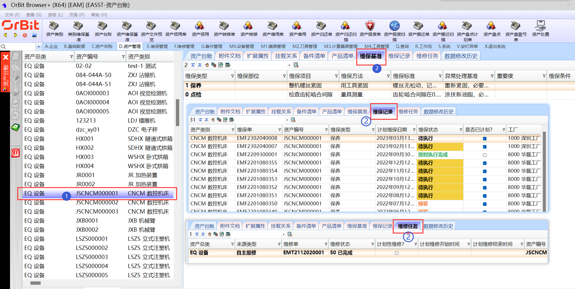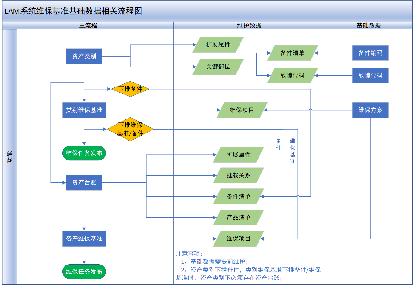 【EAM系统维保基准基础数据相关流程图】:  # **3.5.1.资产类别** **【功能说明】**:维护资产设备的分类结构,用于对系统中的资产设备进行分类管理 **【入口】**:【D.资产管理】>【资产类别】 **【操作前提】**:有维护序列号规则基础数据 **【操作步骤】**: 1)**新增**:点击“新增”按钮 -> 录入资产类别信息 -> 点击“保存”按钮;系统支持复制新增,支持批量新增;  2)**修改**:选择要修改的资产类别 -> 点击“修改”按钮 -> 修改资产类别信息 -> 点击“保存”按钮;  3)**删除**:选择要删除的类别 -> 点击“删除”按钮,弹出删除对话框 -> 点击“是”;  4)**下推维保基准至[设备资产]**:  5)**下推维保基准至[子类]**:  6)**维保任务发布(按类别)**:  7)**下推备件至[设备资产档案]**:  **【注意事项】**:无 **【字段说明】**:无 # **3.5.2.类别维保基准** **【功能说明】**:用户按类别维护资产设备的维保基准 **【入口】**:【D.资产管理】>【类别维保基准】 **【操作前提】**:提前定义好维保类型、责任岗位 **【操作步骤】**: 1)**新增维保基准**:选择资产类别 -> 点击“维保基准”页签 -> 点击“新增”按钮 -> 维护资产类别的维保基准信息,勾选“启用时间计划/启用定量计划”时,需要维护相应的时间计划/定量计划信息,不勾选则无法维护 -> 点击“保存”按钮;  2)**修改维保基准**:  3)**下推维保基准至[设备资产]**:  4)**下推维保基准至[子类]**:  5)**维保任务发布[按类别]**:  6)**下推备件至[设备资产档案]**:  7)**维保基准导入**:  **【注意事项】**:无 **【字段说明】**:无 # **3.5.3.资产台账** **【功能说明】**:用于管理系统管控的资产设备。可以手工创建,也可以在【资产验货】/【设备安装调试】菜单中资产验收确认OK后,点击“资产登录”按钮自动生成资产台账; **【入口】**:【D.资产管理】>【资产台账】 **【操作前提】**:提前维护好资产类别、资产编码、工厂、工作中心等基础数据 **【操作步骤】**: 1)**新增台账**:点击“新增”按钮 -> 维护资产台账基本信息和寿命属性组信息 -> 点击“保存”按钮;  2)**修改**:选择要修改的资产台账 -> 点击“修改”按钮 -> 修改资产台账信息 -> 点击“保存”按钮;  3)**删除**:选择要删除的资产台账 -> 点击“删除”按钮,弹出删除对话框 -> 点击“是”;  4)**条码打印**:选择要打印的资产 -> 点击“条码打印”按钮,弹出是否打印对话 -> 点击“是”,弹出打印预览界面 -> 点击预览界面中的“打印”按钮,弹出打印设置界面 -> 选择打印机,调整打印参数,点击“打印”按钮;  5)**挂载[子资产]**:选择设备资产 -> 点击“挂载[子资产]”按钮,弹出挂载子资产操作界面 -> 勾选要挂载的子资产,是否强耦合:是则勾选/不是则不勾选 -> 点击“提交”按钮,弹出提交成功提示框 -> 点击“是”;  挂载关系可在[挂载关系]页签中查看。 6)**维保任务发布**:选择资产设备 -> 点击“维保任务发布”按钮,弹出确认发布对话框 -> 点击“是”,弹出发布完成提示框 -> 点击“确定”按钮;  维保任务发布规则: a)时间计划-时、日、周维度:发布当前日以后(含当前日)的当前月份的维保计划; b)时间计划-月、季、年维度:发布当前年份的维保计划; c)定量计划:MES系统统计到达到定量次数后,通过接口调用EAM程序,发布一次维保任务; d)根据维保项目的维保类型,生成不同类型的维保任务,同一类型的多个维保项目生成在一张维保任务单中; e)时间计划中的“首轮计划日期”更新后,再次发布时会清理掉当前日之后的维保任务,重新发布当前日之后的维保任务; 7)**查看维保基准/维保记录/维保任务**:选择资产设备 -> 点击[维保基准]/[维保记录]/[维修任务]页签,进入查看;  **【注意事项】**:无 **【字段说明】**:无 ## **3.5.3.1.附件文档** **【功能说明】**:用户按照资产设备来维护维保基准 **【入口】**:【D.资产管理】>【资产台账】-[附件文档]页签 **【操作前提】**:无 **【操作步骤】**: 1)**上传附件**:选择需要上传附件的资产 -> 点击“新增”按钮 -> 添加附件文档信息,上传附件 -> 点击“保存”按钮;  2)**删除附件**:选择要删除附件的资产 -> 选择需要删除的附件 -> 点击“删除”按钮 -> 点击“是”;  3)**修改附件信息**:选择需要更新附件信息的资产 -> 选择需要更新的附件 -> 点击“修改”按钮 -> 修改附件信息 -> 点击“保存”按钮;  **【注意事项】**:文件编号、文档名称不能重复; **【字段说明】**:无 ## **3.5.3.2.扩展属性** **【功能说明】**:用户按照资产设备来维护维保基准 **【入口】**:【D.资产管理】>【资产台账】-[扩展属性]页签 **【操作前提】**: **【操作步骤】**: 1)**新增**:选择资产 -> 点击“新增”按钮 -> 维护扩展属性信息 -> 点击“保存”按钮;  2)**删除**:选择资产 -> 选择要删除的扩展属性 -> 点击“删除”按钮,弹出删除对话框 -> 点击“是”;  3)**修改**:选择要更新扩展属性的资产 -> 选择要修改的扩展属性 -> 点击“修改”按钮 -> 修改扩展属性信息 -> 点击“保存”按钮;  **【注意事项】**: 1.值域类型为“01-枚举”时,属性值必填,只能输入数值;属性值中支持输入多个数值,数字与数字之间用英语逗号隔开; 2.值域类型为“02-区间”时,下限值和上限值必须输入,只能输入数值; **【字段说明】**:无 ## **3.5.3.3.挂载关系** **【功能说明】**:用户按照资产设备来维护维保基准 **【入口】**: