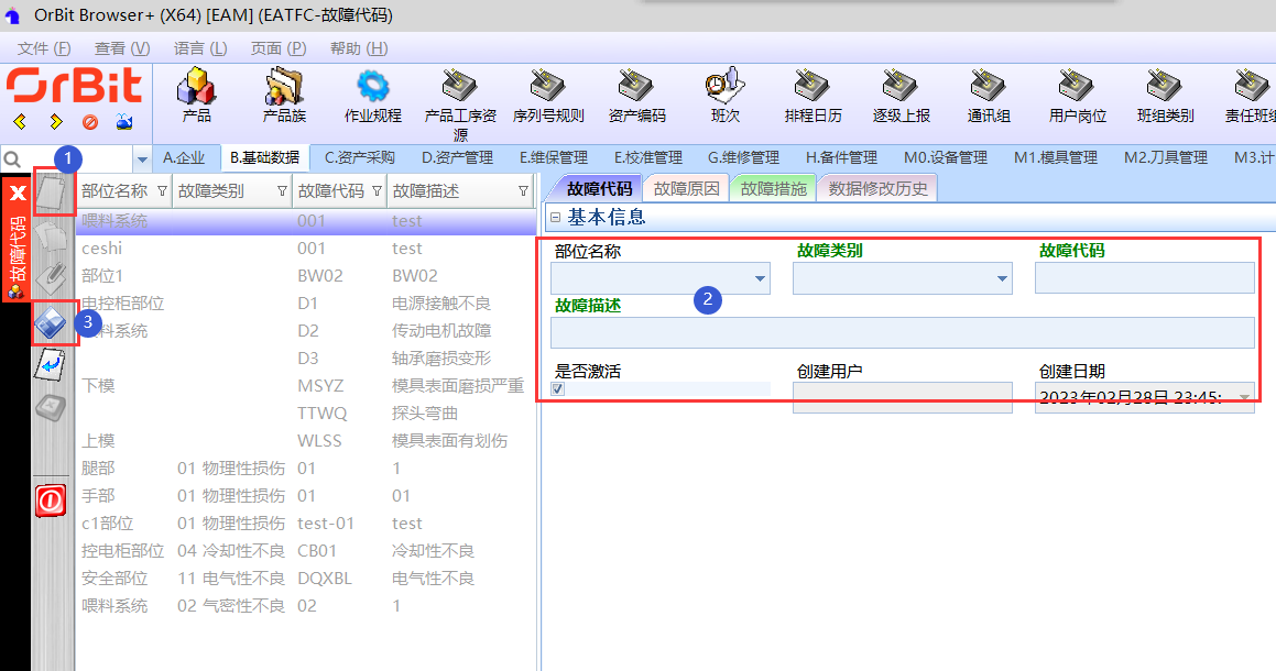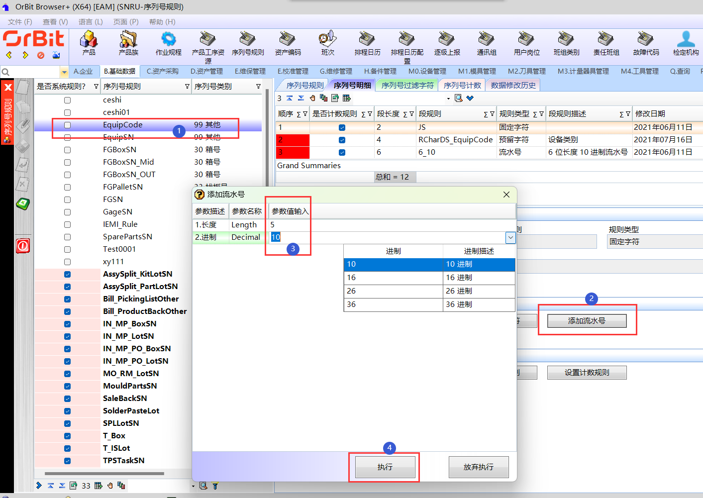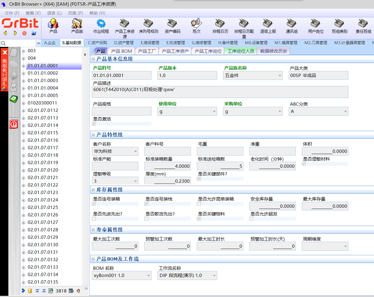 # **3.3.1.产品** **【功能说明】**:移植于【WES】>【产品】>【产品】,仅支持查看产品及产品相关数据。 **【入口】**:【B.基础数据】>【产品】 **【操作前提】**:提前维护产品族数据,有BOM的需要提前维护BOM数据 **【操作步骤】**: 1)查看产品信息;点击【产品】菜单,查看产品信息,可在左下角的 产品料号搜索框 模糊查询 要查看的产品信息;  2)查看产品BOM信息:选择产品 -> 点击进入[产品BOM]页签,查看产品的BOM信息;  3)添加产品工厂:选择产品 -> 点击进入[产品工厂]页签 -> 点击“新增”按钮 -> 维护产品工厂 -> 点击“保存”按钮;  4)修改产品工厂:选择产品 -> 点击进入[产品工厂]页签 -> 选择工厂 -> 点击“修改”按钮 -> 更新产品工厂信息 -> 点击“保存”按钮;  **【注意事项】**: 1.根据产品族大类来区分备件,一般带有“配件”字眼的为备件产品; 2.产品工厂不能重复; 3.产品工厂这里的仓库为产品的默认仓库,备件来料点收时会有默认仓的校验; **【字段说明】**:无 # **3.3.2.产品族** **【功能说明】**:用于维护备件产品族信息 **【入口】**:【B.基础数据】>【产品族】 **【操作前提】**:提前维护产品族大类数据 **【操作步骤】**: 1)**新增**:点击“新增”按钮 -> 维护产品族信息 -> 点击“保存”按钮;系统支持复制新增,支持右键批量新增;  2)**修改**:选中要修改的产品族数据 -> 点击“修改”按钮 -> 修改产品族信息 -> 点击“保存”按钮;系统支持批量修改选中行,支持批量修改所有行;  **【注意事项】**:产品族名称不能重复。 **【字段说明】**: | 字段 | 字段说明 | | --- | --- | | 产品族 | 是指组成同一成品或半成品,不同产品物料的集合。| | 产品族大类 | 对产品族进行的一个分类,在【B.基础数据】>【用户编码定义】-“ProductFamlityType产品族大类”中维护。| # **3.3.3.作业规程** **【功能说明】**:移植于【MES】>【工作流】>【作业规程】。仅支持查看作业规程及作业规程用到的设备资产数据;用于统计产品工序下的设备、工装治具等。 **【入口】**:【B.基础数据】>【产品族】 **【操作步骤】**: 1)查看规程信息:点击进入菜单页面,查看规程信息;可在左下角 规程搜索框 模糊查询 要查看的规程信息;  2)查看规程下的设备资产信息:选择规程 -> 点击[规程_设备资产]页签;  **【字段说明】**: | 字段 | 字段说明 | | --- | --- | | 作业规程 | 即作业时用到的生产工序 | # **3.3.4.产品工序资源** **【功能说明】**:用于维护产品工序资产、产品工序岗位人员,记录不同工作中心中工序岗位人员上工下工记录 **【入口】**:【B.基础数据】>【产品工序资源】 **【操作步骤】**: 1)查看产品信息:  2)查看产品BOM信息:  3)查看产品工厂信息  ## **3.3.4.1.产品工序资产** 【功能说明】:用于维护产品工序及工序用到的资产类别 【入口】:【B.基础数据】 > 【产品工序资源】- [产品工序资产] 页签 【操作前提】:无 【操作步骤】: 1)新增:选择产品 -> 点击“产品工序资产”页签 -> 点击“新增”按钮 -> 维护产品工序资产信息 -> 点击“保存”按钮;系统支持复制新增,支持右键批量新增;  2)修改:选择产品 -> 点击“产品工序资产”页签 -> 选择要修改的产品工序资产 -> 点击“修改”按钮 -> 修改产品工序资产信息 -> 点击“保存”按钮;系统支持批量修改选中行,支持批量修改所有行;  3)删除:选择产品 -> 点击“产品工序资产”页签 -> 选择要删除的产品工序资产 -> 点击“删除”按钮,弹出删除对话框 -> 点击“是”则删除/点击“否”则不删除;系统支持批量删除;  **【注意事项】**:作业工序+资产类别不能重复 ## **3.3.4.2.产品工序岗位** **【功能说明】**:用于维护产品工序的作业用户 **【入口】**:【B.基础数据】>【产品工序资源】-[产品工序岗位]页签 **【操作步骤】**: 1)**新增**:选择产品 -> 点击“产品工序岗位”页签 -> 点击“新增”按钮 -> 维护产品工序岗位信息 -> 点击“保存”按钮;系统支持复制新增,支持右键批量新增;  2)**修改**:选择产品 -> 点击“产品工序岗位”页签 -> 选择要修改的产品工序岗位 -> 点击“修改”按钮 -> 修改产品工序岗位数据 -> 点击“保存”按钮;系统支持右键批量修改选中行,支持右键批量修改所有行;  3)**删除**:选择产品 -> 点击“产品工序岗位”页签 -> 选择要删除的工序岗位数据 -> 点击“删除”按钮,弹出删除对话框 -> 点击“是”则删除/点击“否”则不删除;支持批量删除;  **【注意事项】**:作业工序+岗位不能重复 # **3.3.5.序列号规则** **【功能说明】**:维护序列号的生成规则,从【WES】>【基础数据】>【序列号规则】迁移而来。 **【入口】**:【B.基础数据】>【序列号规则】 **【操作步骤】**: 1)**新增**:点击“新增”按钮 -> 添加序列号规则 -> 点击“保存”按钮;  2)**锁定**:选择未锁定的序列号规则 -> 点击“锁定”按钮,弹出锁定对话框 -> 点击“是”;  3)**解锁**:选择已锁定的序列号规则 -> 点击“解锁”按钮,弹出锁定对话框 -> 点击“是”; 4)**序列号预览**:选择序列号规则 -> 点击“序列号预览”按钮,预览序列号 -> 点击“确定”;  ## **3.3.5.1.序列号明细** **【功能说明】**:维护序列号的明细规则 **【入口】**:【B.基础数据】 > 【序列号规则】- [序列号明细] 页签 **【操作前提】**:无 **【操作步骤】**: 1)添加固定字符:选择序列号规则 -> 点击“添加固定字符”,弹出
