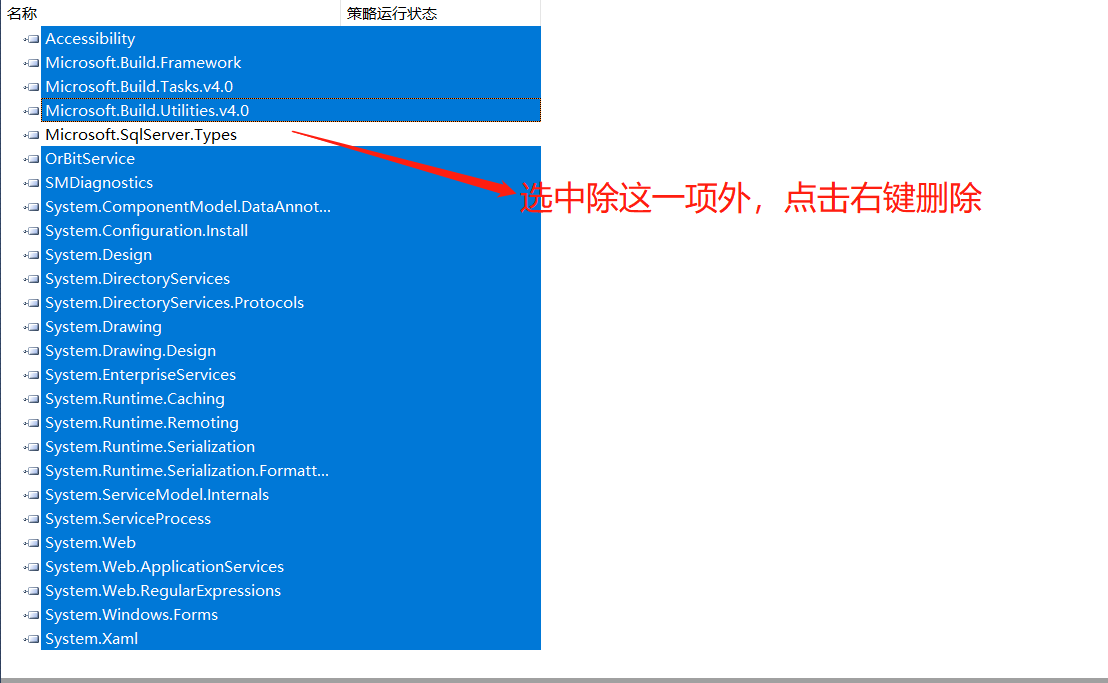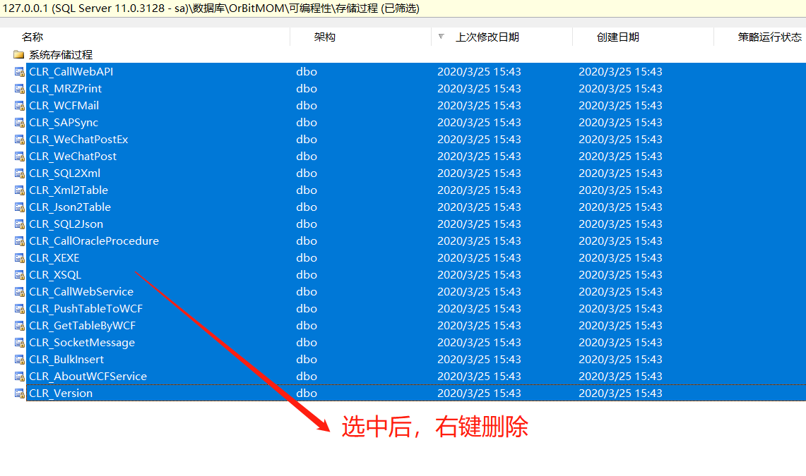 1.CLR 卸载 1)删除数据库中 CLR 相关的存储过程  2)删除数据中相关的程序集 在数据库->可编程性->程序集,选中除 Microsoft.SqlServer.Types 或其它自定义之外的它程序集。 <span style="font-family:楷体;color:red">(注意:卸载之前请确认是否存在非OrBit提供的程序集)</span>  右键点击“删除”按钮